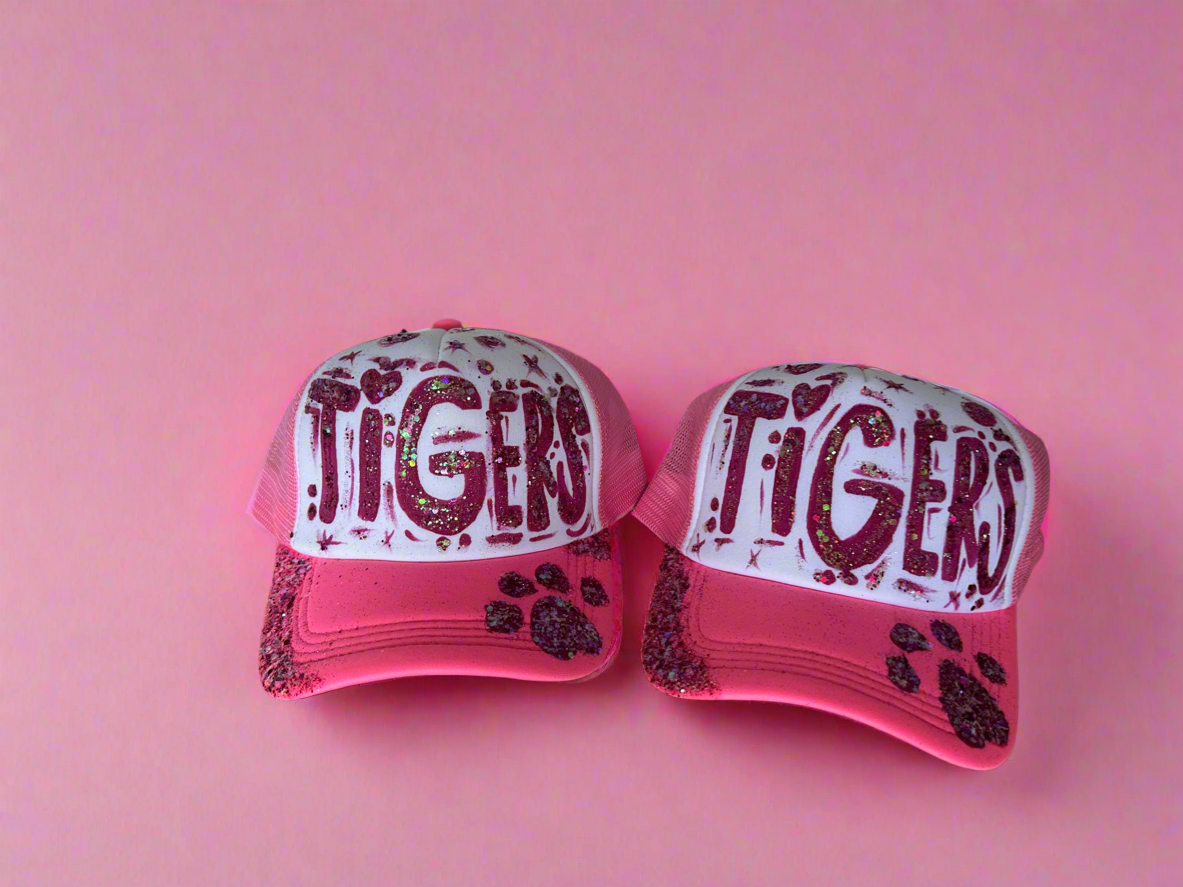Show off your Memphis pride in style with our one-of-a-kind Pink Tigers Trucker Hats! Each hat is hand-painted by Dakota Culver, making every piece a wearable work of art. Designed with a bold pink twist on Tiger spirit, these hats are the perfect blend of sporty and chic.